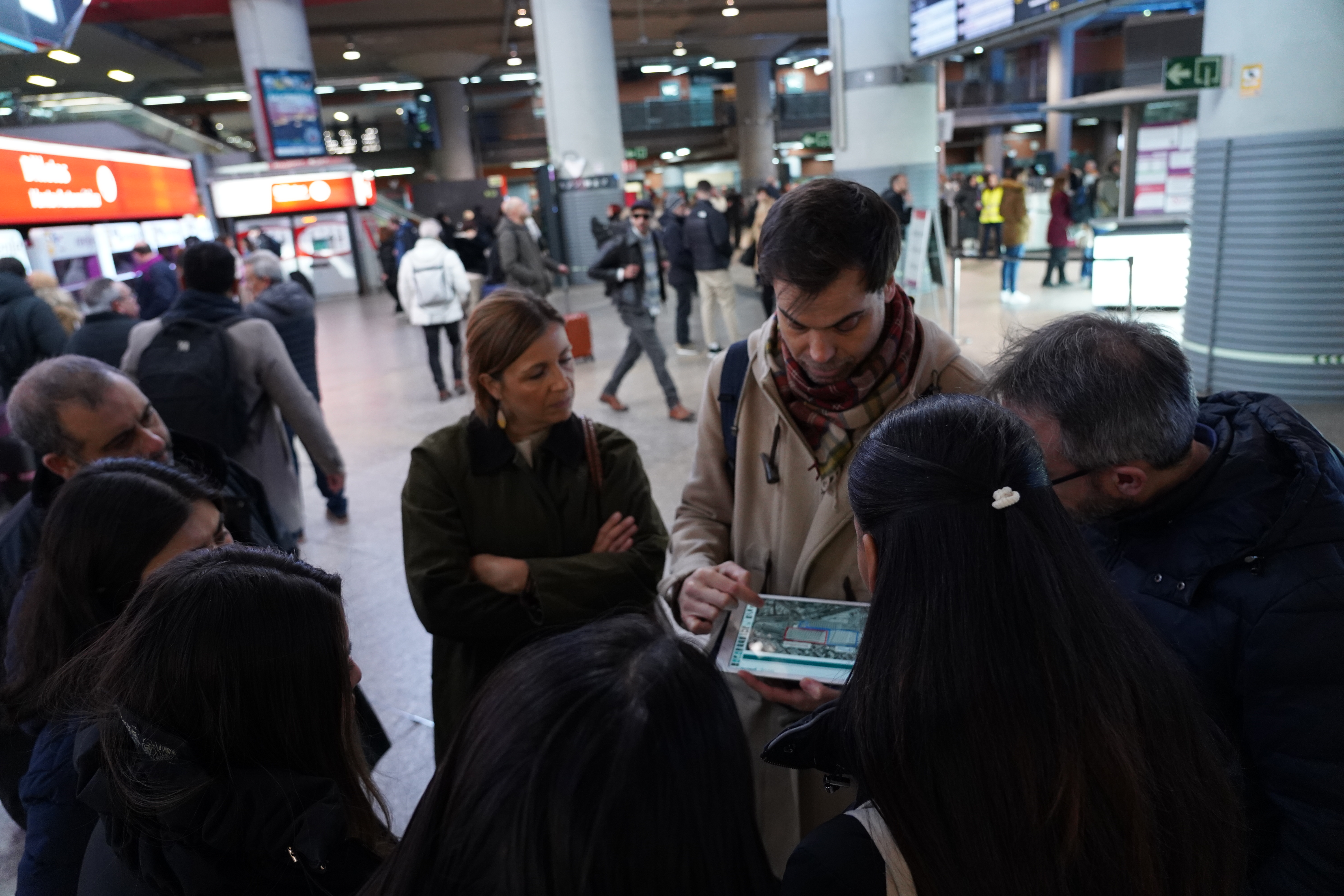 Además de la sesión teórica, el grupo tuvo la oportunidad de recorrer el exterior de la estación de Atocha, donde pudieron conocer más sobre la historia y la arquitectura de esta emblemática infraestructura. Aprendieron acerca del arquitecto responsable de su construcción, Alberto de Palacio, y su evolución hasta convertirse en una estación intermodal que integra servicios de cercanías, larga distancia y metro, facilitando la movilidad de miles de personas diariamente. También se les explicó cómo la estación ha sido testigo de momentos históricos y su papel clave en la conectividad del país.