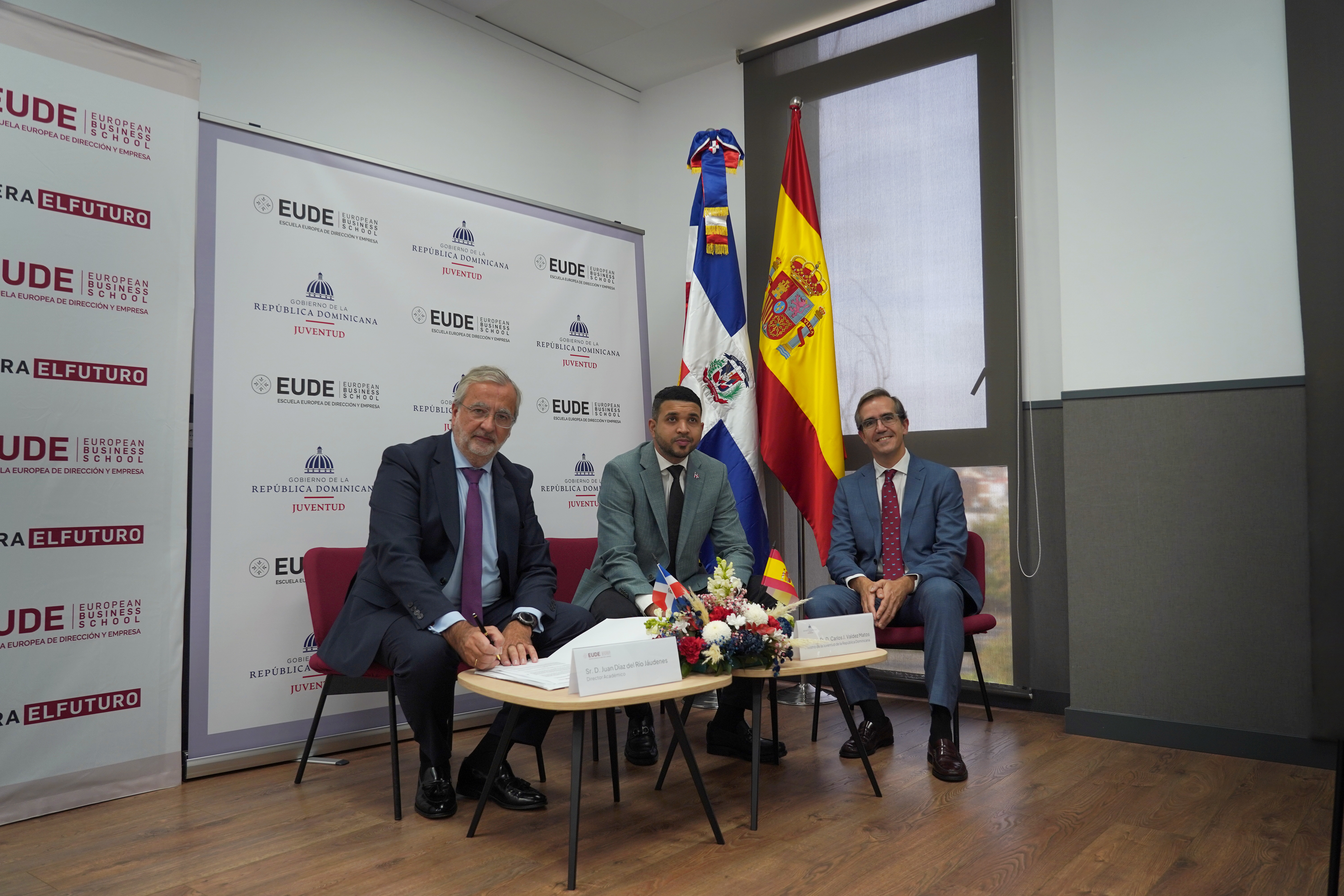 Carlos J. Valdez, Ministro de la Juventud de República Dominicana, ha visitado esta mañana la sede de EUDE Business School en Madrid para materializar el convenio de 505 becas que el Ministerio de la Juventud del país centroamericano ha lanzado este mes en colaboración con la Escuela Europea de Dirección y Empresa. Juan Díaz del Río, Director Académico de EUDE, y Álvaro Dantart, Director de Relaciones Internacionales, han sido los representantes de la institución educativa en este acto. Además, al evento también han acudido alumnos dominicanos de EUDE, quienes han tenido la posibilidad de dialogar y debatir con el Ministro sobre inquietudes y oportunidades de su estancia, estudio y trabajo en España.