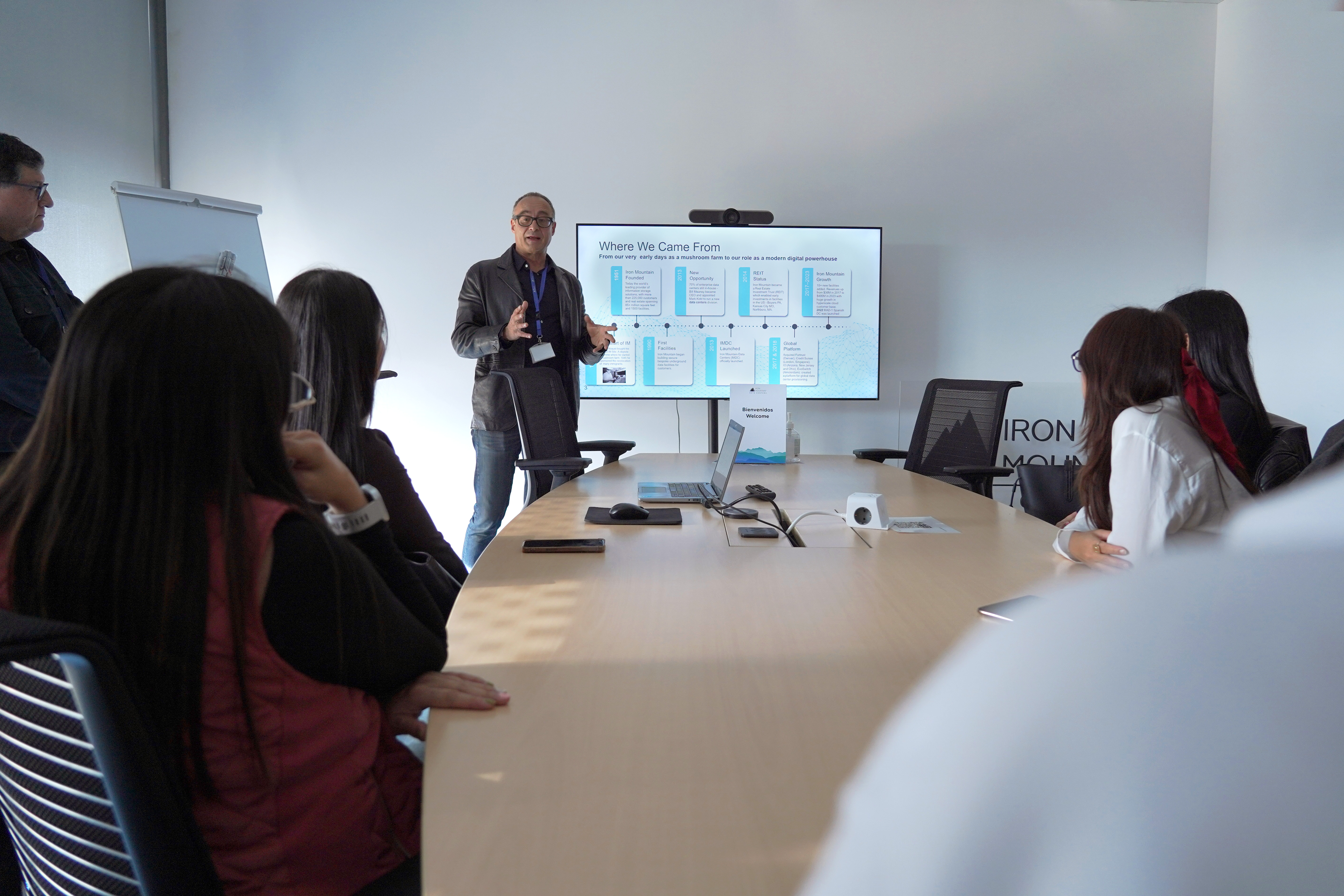 La visita continuó por las oficinas de la compañía hasta llegar a una de las salas de reuniones donde los estudiante recibieron una charla sobre la evolución de los centros de datos, desde su origen hasta su creación y la fundación de Iron Mountain.