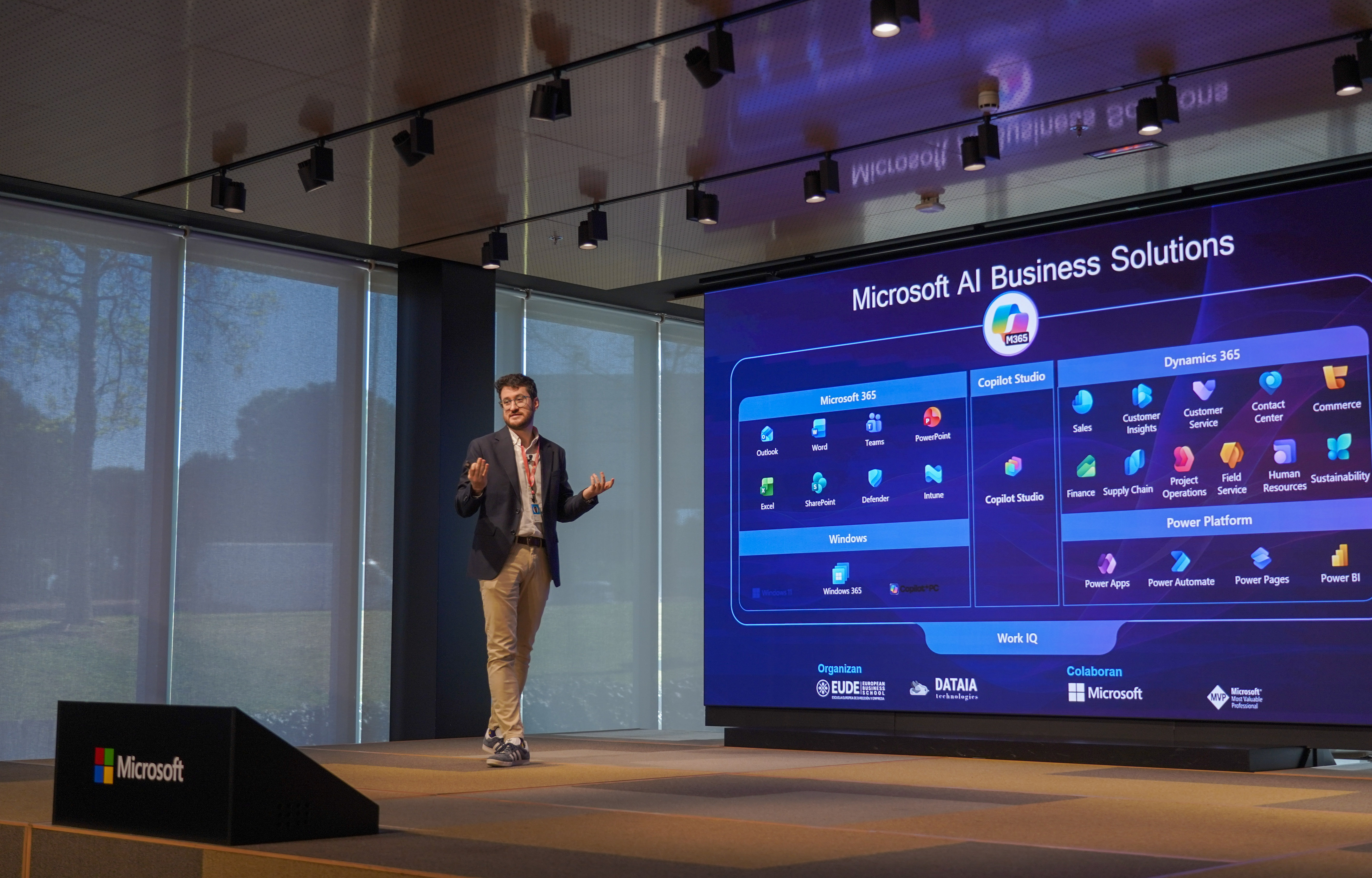 A continuación, el evento profundizó en el ecosistema de soluciones de negocio e inteligencia artificial de Microsoft. David Maqueda mostró, mediante ejemplos prácticos, cómo la IA está revolucionando áreas clave como las operaciones, las ventas y la experiencia de cliente. Por su parte, César Hassen-Bey ofreció una formación aplicada en Microsoft Copilot Studio, donde los alumnos aprendieron paso a paso a diseñar y construir sus propios agentes inteligentes.
