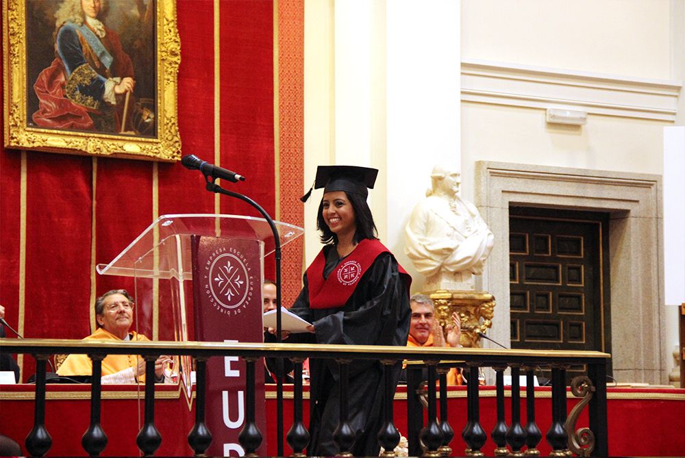 Y sobre este consejo que reflejaba Asúa, nuestra alumna del Máster MBA, Daniela del Carmen Portal versaría su emotivo discurso. Un discurso que iniciaba preguntando a los asistentes “¿Cuál es la verdadera pasión de ustedes?”. Una pregunta que nuestra alumna reflexionaba acerca de nuestra obligación a cumplir todo aquello que nos proponemos y, por el contrario, no conformarnos con lo que tenemos. “Aprender a ser lo que nos gusta” porque lo que nos “hace felices es lo que hacemos”·
