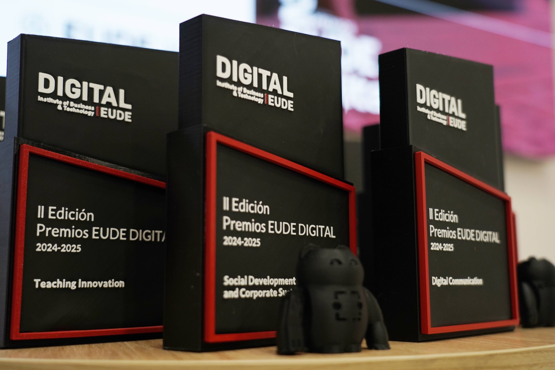 En esta segunda edición de los Premios EUDE Digital, los trofeos han sido diseñados y materializados de nuevo por Ayúdame 3D, una entidad benéfica referente en tecnología social. Su misión es mejorar la vida de las personas con discapacidad mediante la impresión gratuita de prótesis de brazos 3D, fomentando su empleabilidad, escolarización y autonomía.