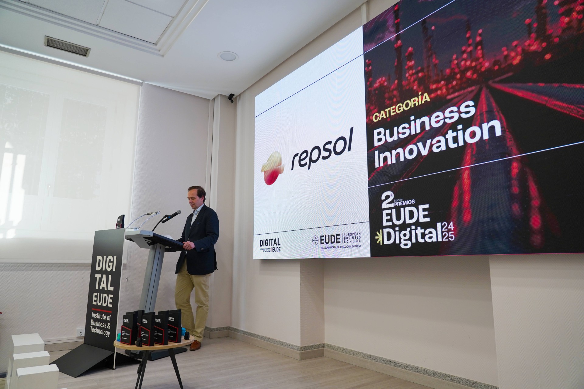 En esta segunda edición de los Premios EUDE Digital se entregaron un total de 10 galardones. En la categoría Business Innovation, REPSOL fue premiada y el galardón fue recogido por D. Antonio Rico de Lara, Head of Digital Transformation Program by Repsol, de manos de D. Juan Díaz del Río, director académico y director de programas MBA para EUDE Business School.
