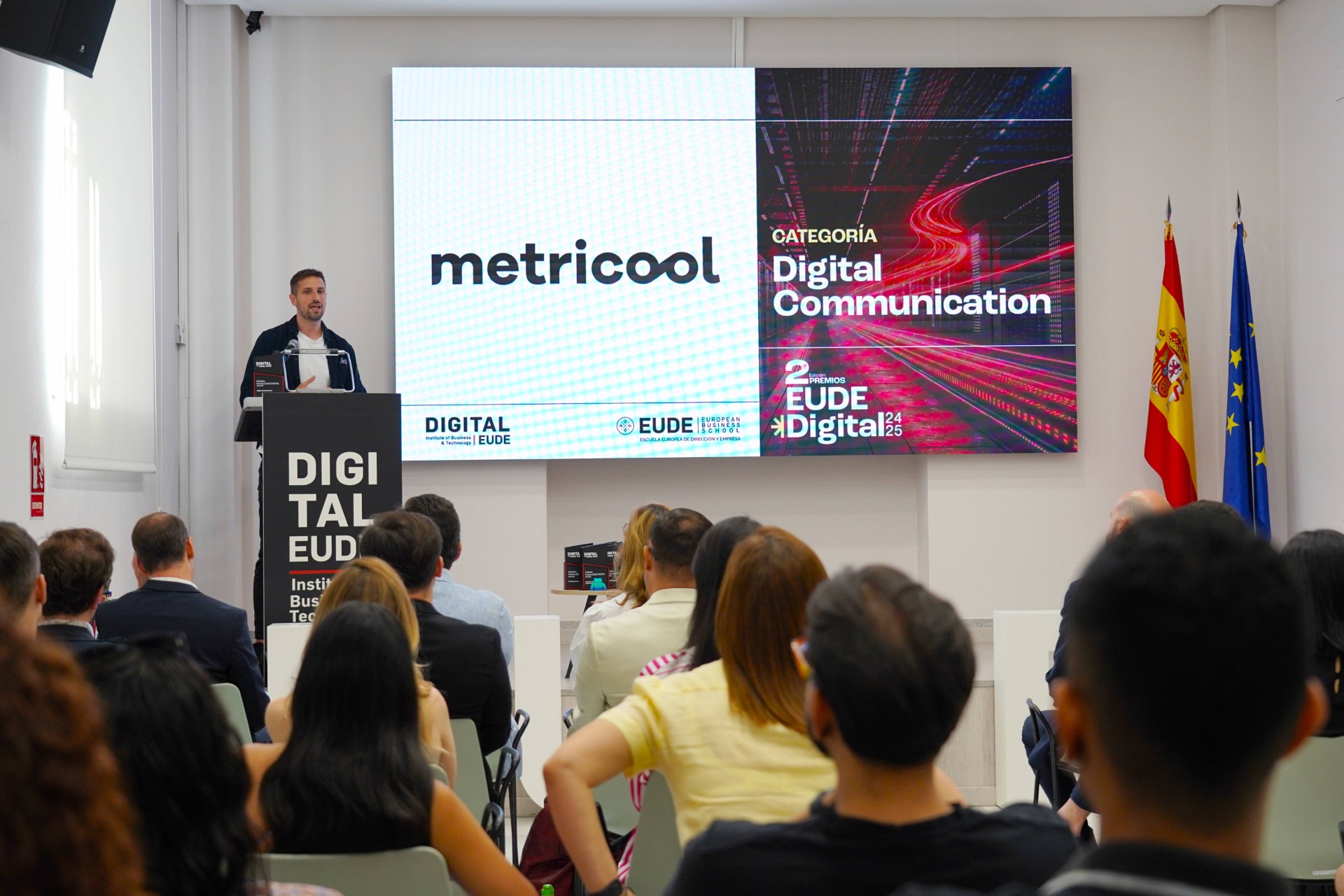 En la categoría Digital Communication, METRICOOL recibió el premio, recogido por D. Jordi San Ildefonso, Marketing Specialist y Responsable de PR y Educación para ESP y LATAM, entregado por D. Jacek Waszkiewicz, director del máster en Marketing y Dirección Comercial de EUDE.